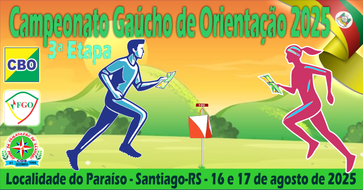 Conforme o calendário oficial, está previsto para os dias 16 e 17 de agosto de 2025 a 3ª e última etapa do Campeonato Gaúcho de Orientação Floresta! O evento será organizado pelo Clube de Orientação de Santiago, e ocorrerá na localidade de Paraíso, na área rural da cidade. Conforme recomendação da organização do evento, é preferível a utilização do Google Maps para se deslocar até o local.